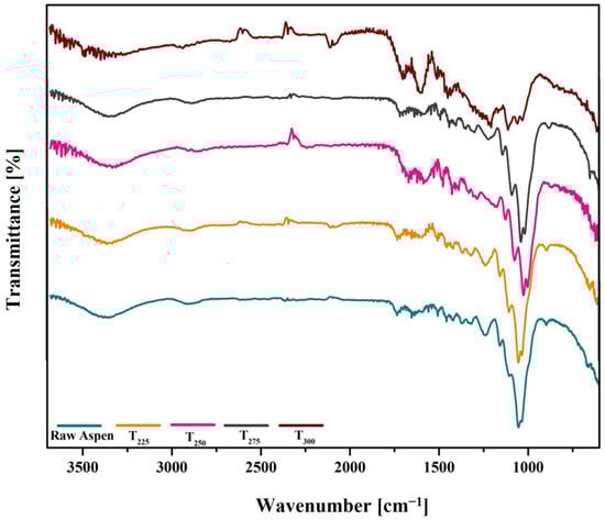 The FTIR spectra of raw and torrefied aspen samples at various temperatures are shown in Figure 4. The broad absorption band between 3600 and 3200 cm⁻1 corresponds to O–H stretching vibrations due to moisture and hydroxyl groups present in cellulose, hemicellulose, and lignin [45]. The intensity of this absorption band decreased notably with increasing torrefaction temperature, indicating moisture loss and hydroxyl group decomposition. C–H stretching vibrations associated with polysaccharides and lignin appeared between 3000 and 2800 cm⁻1, and their intensity diminished progressively with higher pretreatment temperatures, demonstrating the breakdown and fragmentation of aliphatic C–H bonds [46]. Absorption peaks observed in the 1750–1600 cm⁻1 region correspond to C=O stretching vibrations from carbonyl groups in lignin, esters, acetyl groups in xylan, and carboxylic acids [46,47]. The intensity of these peaks decreased significantly in the torrefied samples, reflecting hemicellulose decomposition and loss of associated oxygenated functional groups. The peak around 1510 cm⁻1 is assigned to C=C stretching vibrations within aromatic structures [43]. Additionally, distinct bands between 1250 and 1000 cm⁻1 are associated with C–O–C vibrations, C–H bending, asymmetric C–O–C stretching vibrations in polysaccharides, and C–O vibrations from guaiacyl rings and alcohols [47]. These bands were prominent in raw aspen but exhibited notable intensity reductions with increasing torrefaction temperatures, indicating substantial carbohydrate degradation. The FTIR results thus highlight progressive structural changes in biomass, characterised by moisture reduction, hemicellulose degradation, and volatilisation, ultimately forming a structurally condensed, carbon-rich material [33].