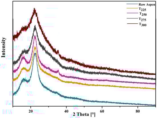 The XRD patterns of raw aspen and torrefied aspen at different temperatures are presented in Figure 5. For raw aspen, sharp crystalline peaks at 2θ values of 16.2° and 22.5° were observed, corresponding to the cellulose crystalline planes (101) and (002), respectively. Thermal pretreatment at 225 °C and 250 °C did not significantly affect the crystalline nature of cellulose, as indicated by the persistence of sharp peaks at these positions. However, upon further pretreatment at higher temperatures (275 °C and 300 °C), a noticeable broadening and diffuse scattering of these peaks occurred, suggesting the breakdown of cellulose chains as well as potential lignin condensation [43]. Raw aspen waste showed the highest crystalline index of 75%. For thermally treated samples, Ic values of 72% and 70% were noted at 225 °C and 250 °C, respectively, indicating only a slight impact on crystallinity at these temperatures. In contrast, substantial decreases in Ic to 48% and 40% were recorded at temperatures of 275 °C and 300 °C, respectively. These reductions highlight a significant breakdown of cellulose crystallinity at elevated temperatures [48].