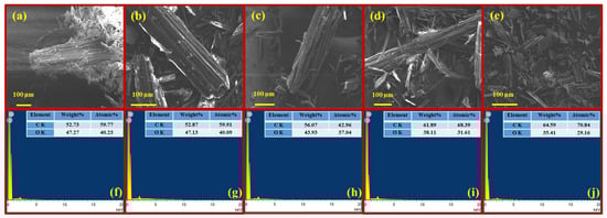 SEM images of untreated and torrefied wood waste: (a) Untreated biomass, (b) wood waste torrefied at 225 °C, (c) wood waste torrefied at 250 °C, (d) wood waste torrefied at 275 °C, (e) wood waste torrefied at 300 °C and EDX spectrogram of untreated and torrefied wood waste. (f) Untreated biomass, (g) wood waste torrefied at 225 °C, (h) wood waste torrefied at 250 °C, (i) wood waste torrefied at 275 °C, (j) wood waste torrefied at 300 °C.