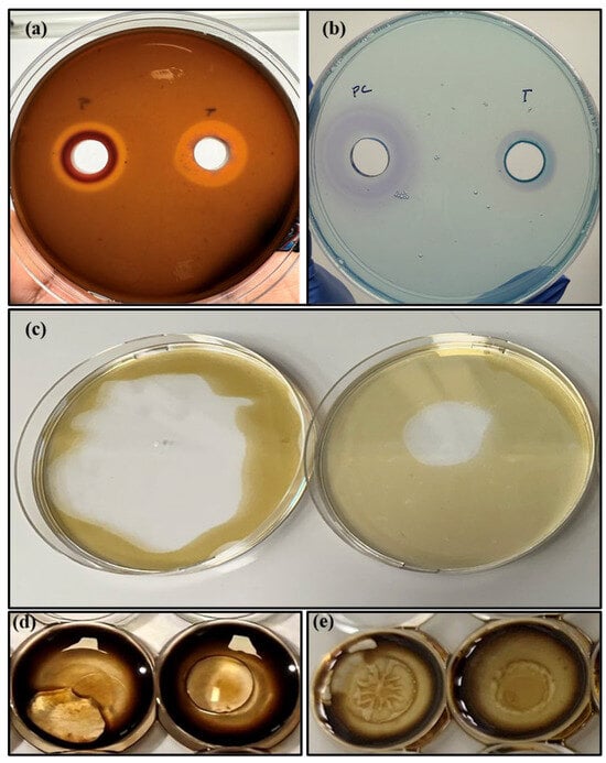 Biosurfactant production in the T225 supernatant was also confirmed using a series of non-quantitative methods, such as the hemolysis assay, CTAB-methylene blue agar assay, and drop-collapse and oil-clearing assay, after adapting the medium constituents for the use of cell-free supernatants instead of live culture [61]. Not all biosurfactants have hemolytic activity [62]; however, the T225 cell-free supernatant exhibited clear β-hemolysis, characterised by a clear zone of approximately 2.2 cm surrounding the well, comparable to the positive control (Figure 8a). In addition, it exhibited a clear blue halo in the CTAB-methylene blue agar assay, which indicated a net negative charge on the crude biosurfactant. The diameter of the halo was less than that formed by the commercial rhamnolipids, suggesting that commercial rhamnolipids have a more net negative charge in their congeners than the T225 cell-free supernatant (Figure 8b).