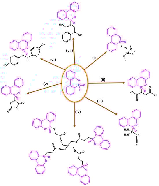 - Salmeia, K.A.; Gaan, S. An Overview of Some Recent Advances in DOPO-Derivatives: Chemistry and Flame Retardant Applications. Polym. Degrad. Stab. 2015, 113, 119–134. [Google Scholar] [CrossRef]