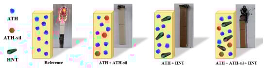 - Paszkiewicz, S.; Irska, I.; Taraghi, I.; Piesowicz, E.; Sieminski, J.; Zawisza, K.; Pypeć, K.; Dobrzynska, R.; Terelak-Tymczyna, A.; Stateczny, K.; et al. Halloysite Nanotubes and Silane-Treated Alumina Trihydrate Hybrid Flame Retardant System for High-Performance Cable Insulation. Polymers 2021, 13, 2134. [Google Scholar] [CrossRef] [PubMed]