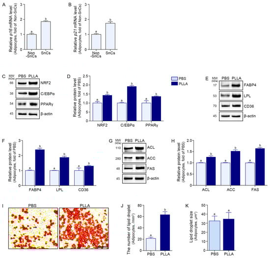 PLLA enhances adipogenesis and lipogenesis in senescent adipocytes. (A,B) qRT-PCR analysis of p16 (A) and p21 (B) mRNA expression levels in senescent adipocytes showed induction of cellular senescence. (C) Western blot analysis of adipogenic transcription factors, NRF2, C/EBPα, and PPARγ, in PBS- and PLLA-treated senescent adipocytes. β-actin was the loading control. (D) Quantification of protein expression in (C), normalized to β-actin and expressed as fold change relative to the PBS-treated senescent adipocyte. (E) Expression of adipogenic factors FABP4, LPL, and CD36 assessed by Western blots. (F) Protein levels in (E) were normalized to β-actin and shown as fold change relative to the PBS-treated senescent adipocyte. (G) Expression of lipogenesis-related factors ACL, ACC, and FAS assessed by Western blots. (H) Densitometric analysis of (G) was performed after normalization to β-actin, and results are presented as fold change compared to the PBS-treated senescent adipocyte. (I) Representative Oil Red O-stained images showing intracellular lipid droplet accumulation and droplet size in senescent adipocytes treated with PBS or PLLA (scale bar = 30 μm). (J,K) Quantitative analysis of the number of lipid droplets (J) and lipid droplet size (K) in senescent adipocytes as a measure from images shown in (I). All data are presented as mean ± SD from at least three independent experiments. Statistical significance was determined using the Kruskal–Wallis test followed by the Mann–Whitney U test. Bars labeled with different letters indicate statistically significant differences (p < 0.05). ACC, acetyl-CoA carboxylase; ACL, ATP citrate lyase; CD36, cluster of differentiation 36; C/EBPα, CCAAT/enhancer binding protein alpha; FABP4, fatty acid binding protein 4; FAS, fatty acid synthase; LPL, lipoprotein lipase; MW, molecular weight; Non-SnCs, non-senescent cells; NRF2, nuclear factor erythroid-2-related factor 2; PBS, phosphate-buffered saline; PLLA, poly-l-lactic acid; PPARγ, peroxisome proliferator-activated receptor gamma; SD, standard deviation; SnCs, senescent cells; qRT-PCR, quantitative reverse transcription polymerase chain reaction.