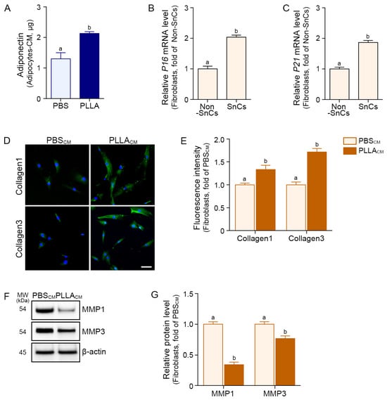CM from PLLA-treated senescent adipocytes modulates collagen and MMP expression in senescent fibroblasts. (A) The adiponectin concentration in adipocyte-CM was measured by an ELISA following PBS or PLLA treatment. (B,C) qRT-PCR analysis of P16 (B) and P21 (C) mRNA expression levels in senescent fibroblasts showed induction of cellular senescence. (D) Representative immunofluorescence images showing collagen1 and collagen3 (green) expression in senescent fibroblasts cultured with PBSCM or PLLACM. Nuclei were counterstained with DAPI (blue). Scale bar = 50 μm. (E) Quantification of collagen1 and collagen3 mean fluorescence intensities from (D). Data were obtained from five randomly selected fields per group. (F) Western blot analysis of MMP1 and MMP3 in fibroblasts exposed to PBSCM or PLLACM. (G) Protein levels in (F) were normalized to β-actin and shown as fold change relative to the PBSCM-treated senescent fibroblast. All data represent mean ± SD from at least three independent experiments. Statistical significance was assessed using the Kruskal–Wallis test followed by the Mann–Whitney U test. Bars marked with different letters indicate statistically significant differences between groups (p < 0.05). CM, conditioned medium; DAPI, 4′,6-diamidino-2-phenylindole; ELISA, enzyme-linked immunosorbent assay; MMP, matrix metalloproteinases; MW, molecular weight; Non-SnCs, non-senescent cells; PBS, phosphate-buffered saline; PBSCM, CM from PBS-treated senescent adipocytes; PLLA, poly-l-lactic acid; PLLACM, CM from PLLA-treated senescent adipocytes; SD, standard deviation; SnCs, senescent cells; qRT-PCR, quantitative reverse transcription polymerase chain reaction.