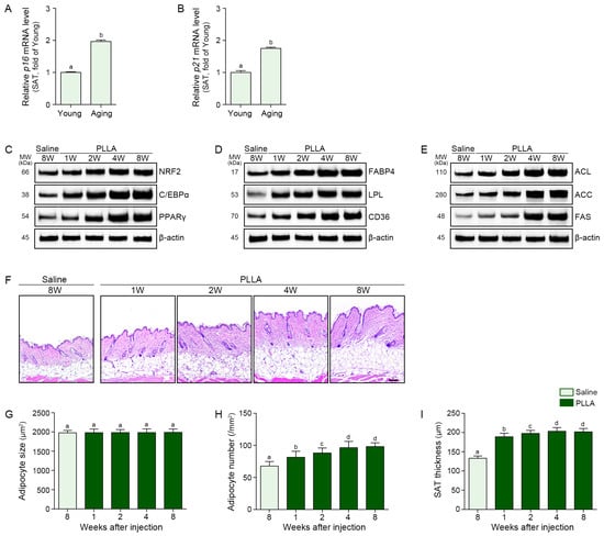 To assess the in vivo effects of PLLA, 12–14-month-old male mice were injected subcutaneously with PLLA (10 mg/mL) or saline, and skin and SAT samples were collected 1, 2, 4, and 8 weeks after injection for analysis (Figure S3). Expression of p21 and p16 increased in the SAT of aged skin (Figure 3A,B). PLLA induced significant increases in NRF2, C/EBPα, and PPARγ in the aged SAT (Figure 3C and Figure S5A–C). PLLA also increased the expression of FABP4, LPL, and CD36 in the aged SAT (Figure 3D and Figure S5D–F) as well as the expression of lipogenesis factor ACL, ACC, and FAS in the aged SAT (Figure 3E and Figure S5G–I). Although expression of all proteins increased with time after PLLA injection, expression levels between 4 and 8 weeks after PLLA injection were not significantly different (Figure 3C–E and Figure S5). Adipocyte size did not increase after PLLA injection in the aged SAT (Figure 3F,G); however, the number of adipocytes and the SAT thickness increased up to 4 weeks after PLLA injection (Figure 3F,H,I). In contrast, no significant changes were observed over time in the saline-injected group (Figure S6).