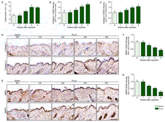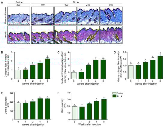 PLLA injection increased adiponectin expression over time in the aged SAT (Figure 4A) as well as collagen1 and 3 in the dermis of aged skin (Figure 4B–D). In contrast, PLLA decreased MMP1/3 over time in the dermis of the aged skin (Figure 4E–G). The collagen fiber density in the dermis, evaluated by Masson trichrome staining, increased over time after PLLA injection (Figure 5A,B). Newly synthesized collagen, which stains blue by Herovici staining versus red for mature collagen [49,50], increased up to 4 weeks after PLLA injection (Figure 5A,C). PLLA treatment also resulted in an increase in mature collagen over time in the dermis of the aged skin (Figure 5A,D). Similarly, dermal thickness increased up to 4 weeks after PLLA injection and skin elasticity, measured using a portable skin analyzer, also increased over time after PLLA treatment (Figure 5E,F).