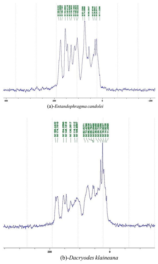 Furthermore, the 13C NMR spectrum analysis of tannin from ADB (Figure 1b) reveals the following distinct peaks: 180, 174, 73, 39, 27, 19 and 14 ppm. The peak at 180 ppm is associated with the –COOH group of protonated acid, originating from hemicellulose degradation. The peak at 174 ppm is linked to the C=O group of xanthones, while the peak at 73 ppm concerns carbohydrates, related to hemicellulose fragments. Finally, the peak at 55 ppm is associated with a –CH3 group linked to an O. The values of 39.8, 24.7, 19.9 and 14.8 ppm are associated with the compounds beta-amyrin, quercetin 3-O-alpha-L-rhamnoside, or the methyl ester of trihydroxy olean-12-en-28-oic acid. The identification of various signals related to phenolic hydroxyl groups confirms the condensed nature of each tannin examined [].