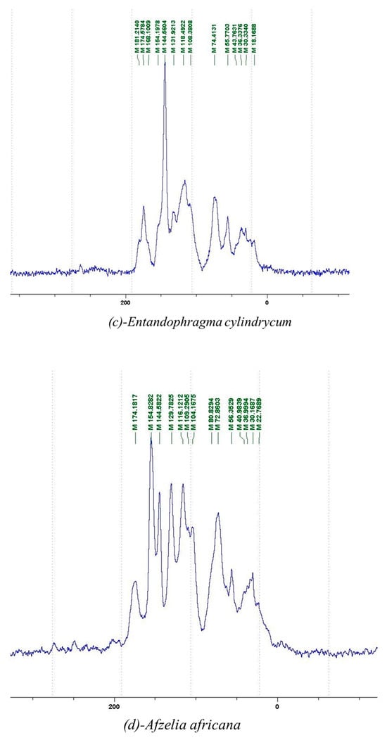 Regarding the tannin profile of DSS (Figure 1d), the notable observed peaks are at 174 ppm; 56 ppm; 40 ppm; 36 ppm and 22 ppm. The peak at 174 ppm indicates the presence of substances such as eriodictyol and methoxyeriodiol, which are sterols. The peak at 56 ppm corresponds to the methyl group –OCH3 found in methoxyeriodictyol. The peak at 40.9 ppm is associated with the C3-H group of eriodictyol. The peaks at 36 ppm and 22.7 ppm indicate the presence of eriodictyol and methoxyeriodictyol, either alone or in combination with other flavonoids. Regarding the flavonoid tannin peaks, particularly those of C5, C7 and C9, which are generally located at 154 ppm, it was noted that the peak intensity is more pronounced. This is because it is an isolated peak for three carbon atoms, rather than the usual two peaks. The peak at 144 ppm indicates the highest concentration noted for C3′ and C4′ compounds. The C1 of flavonoids is associated with a value of 129.7 ppm. The peak at 116 ppm indicates the highest concentration of C2′ and C5′ for flavonoids such as catechin or fisetinidin (hemicellulose residues).