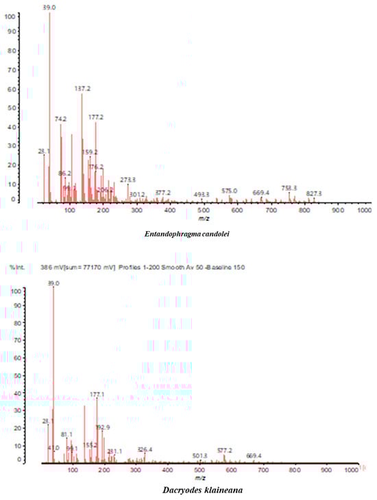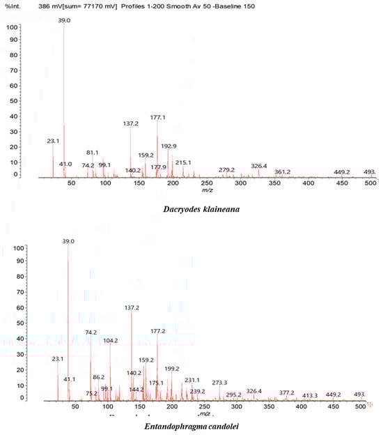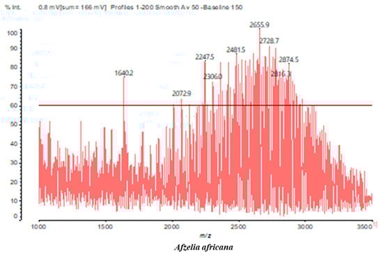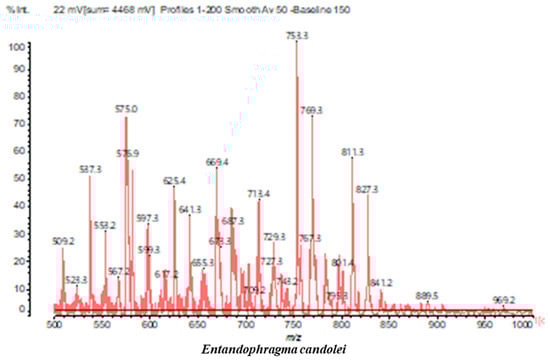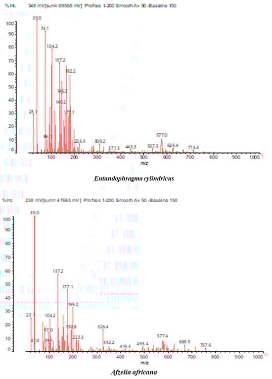 MALDI-TOF analyses of tannins extracted from SPL, KSP, DSS and ADB bark, as shown in Figure 2, Figure 3 and Figure 4, revealed the presence of oligomers already identified in other tannins. In addition, these analyses highlighted the presence of new condensed oligomers, as shown in Table 2.