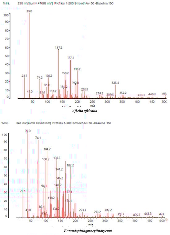 - Kitin, P.; Espinoza, E.; Beeckman, H.; Abe, H.; McClure, P.J. Direct analysis in real-time (DART) time-of-flight mass spectrometry (TOFMS) of wood reveals distinct chemical signatures of two species of Afzelia. Ann. For. Sci. 2021, 78, 31. [Google Scholar] [CrossRef]