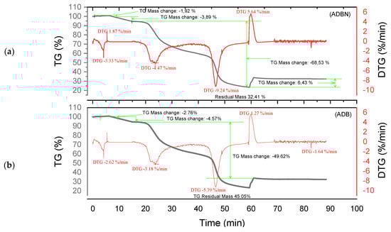 Different degradation patterns with numerous phases are revealed by the thermal study of ADB and DSS tannins (Figure 5a and Figure 6b) and their related resins (ADBN and DSSN) (Figure 5b and Figure 6a). At 95 °C, both ADB tannin and ADBN resin first lose water and volatiles [,]. At 275 °C, tiny molecules or heteropolysaccharides begin to degrade []. Due to its aromatic nature and mineral content, including silica [], ADB tannin exhibits a third substantial degradation phase at 525 °C, which is linked to the breakdown of polyphenolic structures. At 600 °C, it yields a high char yield of 45.05% [], whereas the ADBN resin degrades significantly at 600 °C, with a final residue of 32.41% at 625 °C, indicating a complex and thermally stable network of polymers. Similar to this, the DSSN resin has a final residue of 31.77% at 800 °C after initial moisture loss at 56.67 °C, volatilization of light compounds at 114.95 °C, main degradation at 241.63 °C and a second major breakdown at 371.19 °C, most likely involving aromatic structures [,]. With disintegration phases at 53.11 °C, 112.48 °C, 204.35 °C and 374.96 °C—the last of which shows the breakage of stable aromatic rings—DSS tannin exhibits a similar pattern. It concludes with a high residue of 43.18%, indicating that its dense aromatic component has given it significant thermal stability.