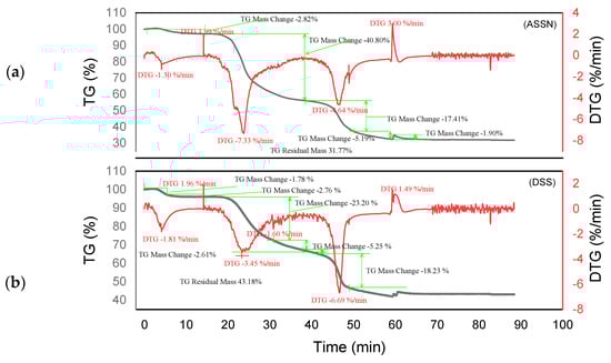 Compared with commercial tannins such as Pinus maritimus or Schinopsis balansae [,], which have decomposition temperatures below 380 °C, these tannins stand out for their superior thermal stability. Furthermore, in comparison with recently analyzed tannins such as Dacryodes klaineana (525 °C) or Entandophragma cylindricum (280–310 °C), ADB tannin achieves comparable performance, while DSS stands out for its superior thermal and residual resistance. Thus, ADB and DSS tannins combine high thermal performance, structural stability and advanced application potential. These characteristics make them particularly suitable for demanding applications such as ecological resins, heat-resistant adhesives and corrosion inhibitors.