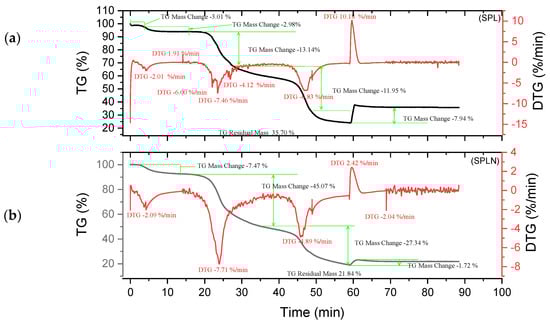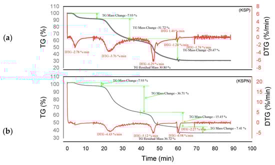 The tannin and resin samples reveal specific thermal behaviors with multi-phase degradation patterns when subjected to thermogravimetric analysis. At about 100 °C, all materials show early dehydration due to the removal of both bound and free water [,]. Similar decomposition profiles are shown by the tannin samples KSP and SPL. Early degradation starts at 200–280 °C, followed by main pyrolysis phases with primary DTG peaks at 320 °C, which involve the breakdown of polyphenolic structures and the cleavage of C–C/C–O bonds []. Decomposition is finished by 450–500 °C, with final residues of 30.80% (KSP) and 35.70% (SPL), indicating significant fixed carbon formation. Resin samples KSPN and SPLN, on the other hand, show more intricate degradation mechanisms with earlier onset temperatures (180–250 °C) and multiple distinct DTG peaks []. SPLN exhibits intense depolymerization at 290 °C, followed by secondary peaks at 380 °C and final decomposition extending to 480–500 °C []. KSPN shows primary degradation at 290 °C and secondary at 350 °C. The resin samples exhibit different residual behaviors. SPLN produces only 21.84% residue, showing more thorough combustion and less fixed carbon formation than tannin materials, whereas KSPN produces 36.72% residue, revealing its extensively cross-linked structure.
