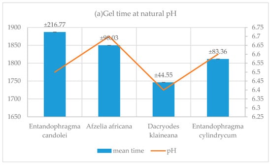 The results in Table 4 and Table 5 and Figure 9 show that, for adhesive systems (KSPN), (DSSN), (ADBN) and (SPLN) at natural pH (6.4 and 6.7), gel time is significantly longer than when the pH is adjusted by adding NaOH (11.2–11.8). In the study carried out on resins and their use in the panel manufacturing process, it was observed that their shaping requires a pressing time of 600 s []. However, this time varies between 427 s and 448 s seconds when the pH is adjusted. This result is in line with the industrial panel manufacturing process. Two conclusions can be drawn from these results. Firstly, the adhesive systems (KSPN), (DSSN), (ADBN) and (SPLN) were shown to react and crosslink. Secondly, it has been established that these cross-links occur within a timeframe that meets industrial requirements. Although synthetic resins have a shorter curing time (urea-formaldehyde (UF) commercial 127 s) [] than natural resins, the reactivity of the corrected resins formulated in this study remains interesting compared to that of others. This is the case for resins formulated with Mimosa tannin and hexamine (600 s) and Mimosa tannin and lignin in proportions of 90/10, 80/20 (623 s, 620 s) []. In addition, formaldehyde resins have been shown to have a very short gel time, of around 50 s at 100 °C for pure Maritime pine tannin cured with paraformaldehyde []. Compared with the longer gel time of the resin formulated in this study, we can therefore affirm that our resin does not contain a significant amount of aldehyde [] and is therefore environmentally friendly.