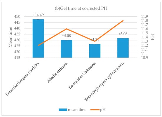 Approximately 10 g of the formulated resin without the addition of a sodium hydroxide (NaOH) solution (33% NaOH) was introduced into a test tube and placed in a water bath, maintained at boiling temperature (100 °C) at normal atmospheric pressure. A metal spring was inserted into the test tube and moved rapidly up and down. The gel time was measured using a stopwatch. The test was performed three times and the average value is reported as in []. Then, the resin was formulated by adding a sodium hydroxide solution (33% NaOH) to adjust the different pH levels of the mixture [].