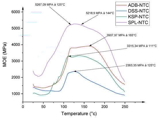 TMA results for the different resins formulated with each tannin and Acacia nilotica hardener are shown in Figure 10. Figure 10 shows four curves whose shape varies according to the reactivity of each tannin with the hardener. The resin formulated with SPLN tannin had the highest modulus of elasticity (5267 MPa) compared with the other formulations. This is followed by the ADBN tannin-based resin with a modulus of elasticity of (3907 MPa), then that formulated with KSPN tannin with a value of (3315 MPa) and finally that with DSSN tannin at (2363 MPa). This result can be justified by several factors, including the number of free reactive sites, the arrangement of the polymer chain, the degree of polymerization, the type of interflavanoid bonds, the natural variability of tannins and steric hindrance []. Covalent and ionic bonds can be formed between the various resin components. For these reasons, the MOE of the tannin adhesive may increase depending on the wood species. The presence of aromatic -OH functions may also be at the origin of this result. The presence of free hydroxyl groups makes tannin easily accessible and feasible for chemical modification [,]. Recent studies have shown that resins based on tannin as the main component and furfuryl alcohol are less effective. This is because furfuryl tannin resins interact with tannin, rather than being involved in self-condensation reactions. Three reaction mechanisms are possible: serial condensation, hydroxyl group interaction and furan ring rearrangement. Rearrangements lead to a cross-linking reaction [,]. Since the hardener used is furan-based, crosslinking is more effective with SPL tannin than with other tannins. However, the resins formulated and examined offer new prospects for the formulation of formaldehyde-free wood-based adhesives. The conclusions drawn concur with those of Osman, who characterized the tannin of Acacia nilotica spp. nilotica (Ann). His results show that the maximum Young’s modulus values are between 3300 and 3600 MPa []. In addition, the results obtained from this analysis are better than those of resins formulated with hexamine and tannin from Sumac (2282 MPa), Pomegranate (2100 MPa), Mimosa (2665 MPa), Quebracho (2464 MPa) and Aleppo Pine (2500 MPa) []. This highlights the high performance of the different resins formulated in this study.