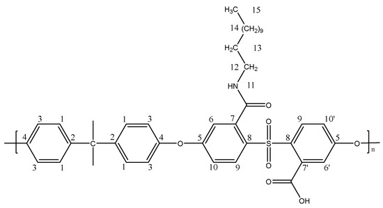 A solution of a Udel polysulfone (10.00 g, 0.0226 mol) was dissolved in THF (180 mL) and cooled to −78 °C. n-Butyllithium (1.6 M, 30 mL) was added dropwise at about one drop per second using an addition funnel under nitrogen. The solution initially exhibited a green color, later changing to a red brown solution. After the addition, the solution was stirred for 1 h, and then the cooling bath was removed. 500 g of dry ice was added to the lithiated polysulfone and vigorously mixed with a large spatula. Throughout the dry-ice addition, the flask was continuously swept with a fast stream of nitrogen to prevent moisture condensation. The resulting white polymer was left overnight to warm to room temperature, precipitated into isopropanol, and dried at 60 °C in a vacuum oven for 24 h. The dried polymer was stirred for 24 h at room temperature with a dilute aqueous HCl solution (10 wt.%) to obtain the dicarboxylic acid form. Finally, the polymer PSF-COOH, as shown in Figure 1, was washed with distilled water until reaching a pH of 7 and dried at 60 °C in a vacuum oven for 48 h and a yield of 7.3 g (83%) was obtained.