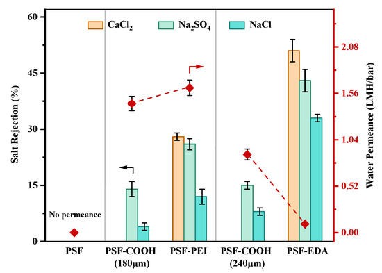 In salt rejection experiments, the PSF-PEI and PSF-EDA membranes achieved significantly higher salt rejection than the PSF-COOH membrane. Due to the Donnan exclusion, the PSF-COOH membrane exhibited no rejection of CaCl2, demonstrating its inability to filter out positive divalent ions [33]. However, crosslinking effectively reduced charge distribution, demonstrating its positive impact on ion rejection.