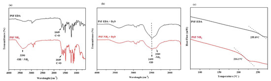 (a) ATR-FTIR spectra of membranes PSF-EDA and PSF-NH2; (b) ATR-FTIR spectra of membranes PSF-EDA, PSF-NH2 after H/D exchange with D2O; (c) DSC results of both membranes.