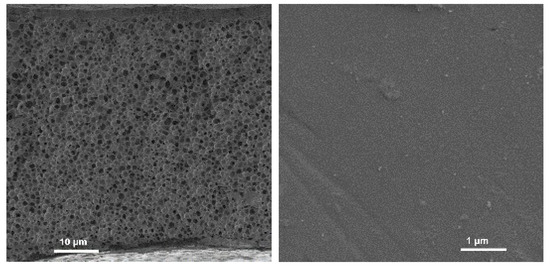 Cross-sectional and surface SEM images of membranes PSF-NH2, thickness 55.7 µm.