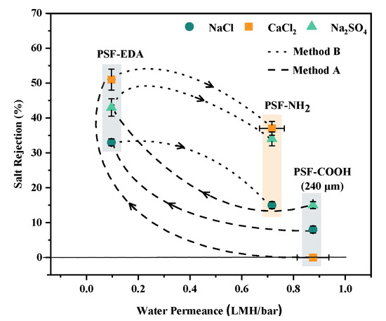 Figure 9 compares the membrane performance using method A and method B, illustrating the trends in water permeance and salt rejection for PSF-COOH, PSF-EDA, and PSF-NH2. As observed in method A, the water permeance of PSF-EDA was significantly lower than that of PSF-COOH, while its salt rejection was markedly higher. Upon partial hydrolysis of the crosslinkers, the PSF-NH2 membrane achieved a remarkable sevenfold increase in permeance. Notably, this hydrolysis process did not significantly reduce salt rejection, with the PSF-NH2 membrane achieving 37% rejection for CaCl2 and 34% for Na2SO4. This increase in permeance without substantial loss of salt rejection efficiency suggests that controlled hydrolysis effectively enhances membrane permeability while maintaining selective separation.