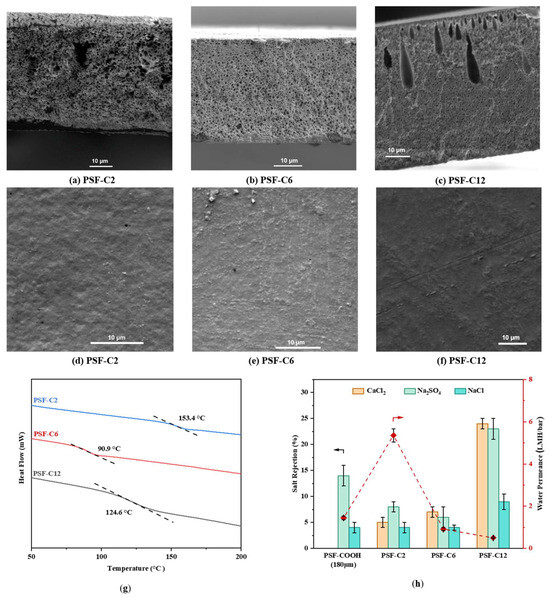 Cross-sectional SEM images of membranes. (a) PSF-C2, thickness 51.3 µm; (b) PSF-C6, thickness 32.6 µm; (c) PSF-C12, thickness 47.0 µm. Surface SEM images of membrane (d) PSF-C2; (e) PSF-C6; (f) PSF-C12; (g) DSC results of PSF-C2, PSF-C6 and PSF-C12; (h) plots of permeance of distilled water and salt rejections. Salt permeance data are not presented, as they differ by less than 2% from water permeance.