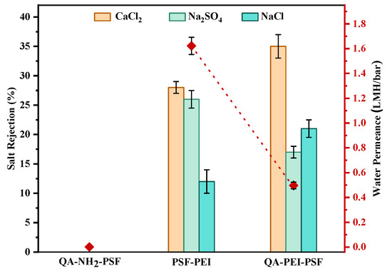 In salt rejection experiments, the QA-PEI-PSF membrane exhibited the following order of rejection: CaCl2 > NaCl > Na2SO4. As the membrane incorporated quaternary ammonium salts and carried a positive charge, its salt separation mechanism relied mainly on the Donnan exclusion. For larger cations like Ca2+ the positively charged membrane exerted a stronger repulsive force, impeding their transport across the membrane and resulting in enhanced rejections. Conversely, for larger anions, SO42−, the membrane demonstrated a lower rejection [24,33].