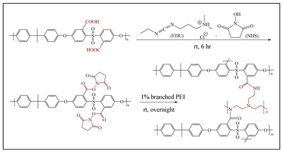 The activated membrane was brought into contact with a 1 wt.% branched polyethylenimine (PEI) in a water solution (500 mL) overnight to carry out the in situ crosslinking reaction between the activated PSF-COOH and the PEI molecules. The obtained membrane was rinsed with distilled water several times and stored in a distilled water bath before testing. The preparation route is illustrated in Scheme 1.