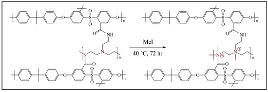 The PSF-PEI (1.00 g, 0.0016 mol) or PSF-NH2 (1.00 g, 0.0016 mol) membranes were immersed in an excess of MeI (4.00 mL) for 72 h at 42 °C under reflux conditions, with the setup covered by aluminum paper to prevent exposure to sunlight. The color of the membrane changed to yellowish after 48 h. The obtained membranes, QA-PSF-PEI and QA-PSF-NH2, were rinsed with distilled water and stored in a water bath before undergoing permeance measurement (Scheme 4).