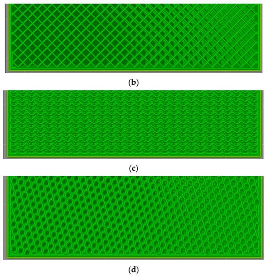 Used infill patterns: (a) cubic, (b) grid, (c) gyroid, and (d) honeycomb.