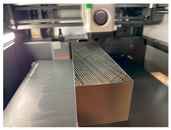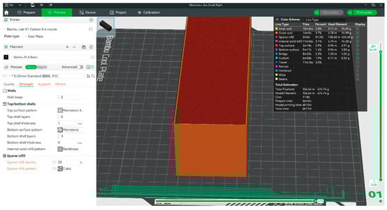 After the G-code was generated, it was executed on a Bambu Lab X1 Carbon Combo 3D printer, using a Bambu Cool Plate coated with one layer of Bambu glue to improve material adhesion to the surface, which does not affect any properties. The main printing parameters for cuboid 3D printing are presented in Table 1 (only the infill pattern was different for each group of cuboids).