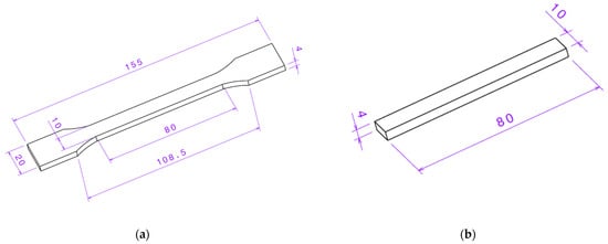 Design of specimens used for testing of (a) tensile properties according to ISO 527-2; and (b) flexural properties designed according to ISO 178 (dimensions in mm).