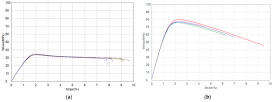 Figure 6 presents the stress–strain curves obtained after tensile and flexural mechanical properties testing.