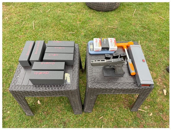 The experiment was conducted at an outdoor shooting range at a temperature of 18 °C and cloudy weather (relevant to the valid functionality of the used chronograph). The design of the experiment ensures full repeatability, and the entire procedure is described below, accompanied by a photograph of the setup. A metal stand, anchored into the ground with an extended arm, was used to hold the cuboid target, which was secured with two layers of standard adhesive tape. In front of the stand and target, a non-branded chronograph was positioned to measure the projectile velocity. The chronograph operates by detecting the time it takes for the projectile to pass between two optical sensors spaced at a known distance. Positioned in front of the chronograph was a fixed mount holding the firearm. The distance between the gun barrel and the target was 1 m.