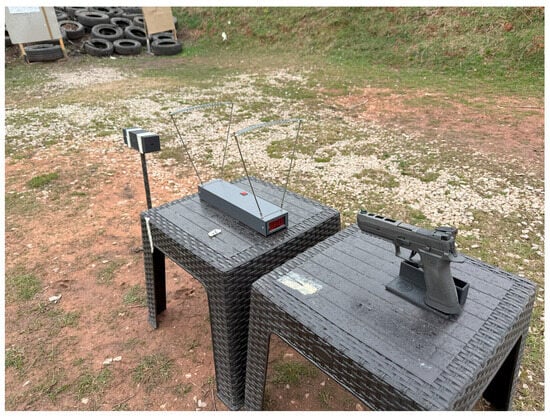 The firearm used was a Sig Sauer X-Five Legion (Sig Sauer, Eckernforde, Germany) with a 5-inch barrel. Ball 9 × 19 mm ammunition with 124-grain projectiles (mass: 8 g), manufactured by PTG (Pobjeda Technology Goražde, Goražde, Bosnia), was used. In total, there were 12 targets—3 targets per infill pattern (4 different patterns). Each of the 12 targets was hit once, each by a distinct projectile. The average measured velocity for all twelve projectiles was 355 m/s, with velocities ranging from 354 to 368 m/s, which falls within the standard range for this weapon and ammunition type. In order to check the mass of the projectile, the cartridge was carefully disassembled by using the kinetic hammer. It was confirmed that the mass matched the value specified by the manufacturer. The equipment used for the experiment is presented in Figure 7.