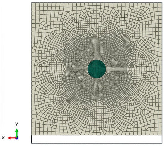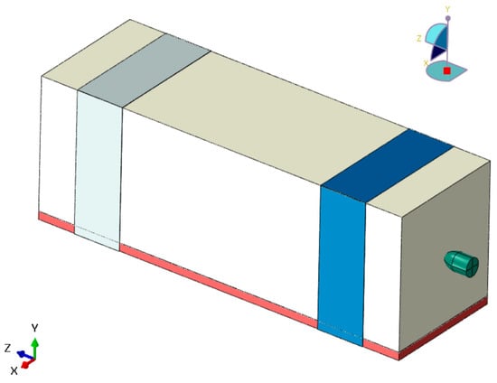 PLA Block (3D-Printed Polymer): The PLA material was defined as an orthotropic elastic–plastic solid with damage to capture the anisotropy from the printing process and the failure under high strain rates. Elastic constants were taken from manufacturer filament data for printed PLA [61]. Table 5 summarizes the PLA properties used. The in-plane modules (Ex, Ez) represent the stiffness along the print raster directions, and the through-thickness modulus (Ey) is lower due to the layer interfaces. Poisson’s ratio (ν) and shear modulus (G) were estimated based on filament data and calibrated with the tensile tests of the printed samples. Although experimental tensile tests conducted specifically on Bambu Lab PLA filament specimens exhibited plastic yielding at approximately 35 MPa with minimal post-yield hardening, a higher yield strength of 50 MPa was employed in the numerical model. This discrepancy can be rationalized by considering both the specimen size effects and the inherent strain-rate sensitivity of PLA. Under impact conditions, larger specimens typically demonstrate elevated yield strengths due to multiaxial stress states, constrained molecular deformation mechanisms, and strain-rate-induced stiffening, all phenomena well-documented in the polymer deformation literature [62,63]. A ductile damage criterion was employed: damage initiates at an equivalent plastic strain of about 5% (εfail≈ 0.05), representing the onset of microcracking in PLA. The decision to use a 5% equivalent plastic strain (PEEQ) threshold for damage initiation in this numerical model is grounded in established polymer deformation and failure behavior under complex loading, rather than uniaxial tension alone [64,65]. Once damage was initiated, a linear damage evolution law was applied, with an energy dissipation (fracture energy) of the order of 2.5 kJ/m2, ensuring mesh-size-independent energy failure. Complete failure (damage variable D = 1) led to element deletion (erosion) and to model material separation. Section controls in Abaqus were set to allow element deletion upon failure and to enhance hourglass stiffness. Reduced-integration 8-node brick elements (C3D8R) were used for the PLA, with hourglass energy monitored to remain <5% of the internal energy (it stayed <2% in this model, indicating stable deformation modes).