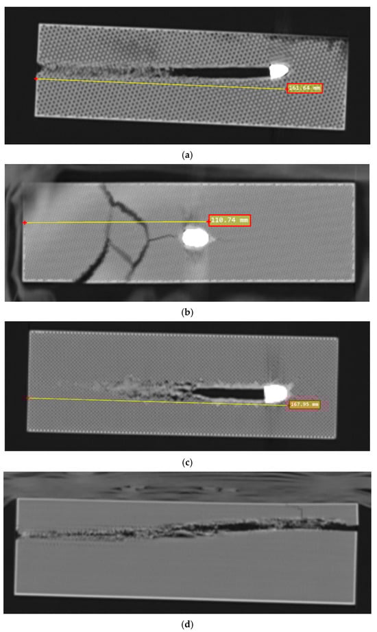 Given that a significant number of projectiles remained embedded in the target and their trajectories were not linear, a destructive method of measuring penetration depth would require dismantling the target and extracting the projectile. Such an approach could lead to inaccurate results due to the potential displacement of the projectile during extraction and other unintended effects. Therefore, as previously mentioned and explained, a non-destructive method using CT scanning was employed. The penetration depth of each projectile is presented in Table 6, while Figure 12 shows a representative CT scan for each type of varied infill sample.