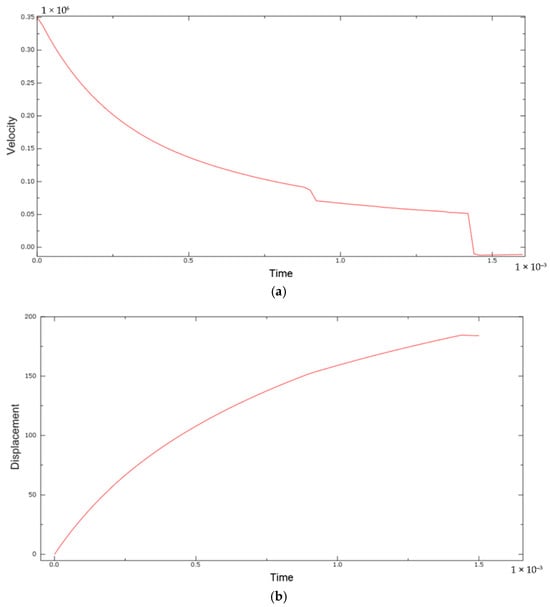 Contact and Interface Modeling: The numerical model employed a hybrid contact formulation combining explicit surface-to-surface penalty contact at the initial surface contact, general contact interaction for the penetration of the primary bullet–PLA interaction, and tie constraints for secondary interfaces. The bullet surface was defined as the master surface (rigid body), and all nodes on the PLA block acted as the slave surface. Penalty-based contact controls included a defined contact stiffness scale factor (0.03) and warp–check controls (cutoff of 15 and period of 10 increments) to ensure numerical stability and minimize penetration artifacts. The friction coefficient was set to 0.35, aligning with realistic but conservative assumptions for PLA–bullet interaction [68,69,70]. The PLA block rested on a rigid steel support, modeled via frictionless penalty contact. A thin masking tape was modeled explicitly with tie constraints bonding it rigidly to both PLA and steel support surfaces, simulating adhesive bonding without cohesive failure. No contact instabilities or unrealistic penetrations occurred during simulation, confirming that the chosen hybrid contact setup effectively represented experimental conditions.