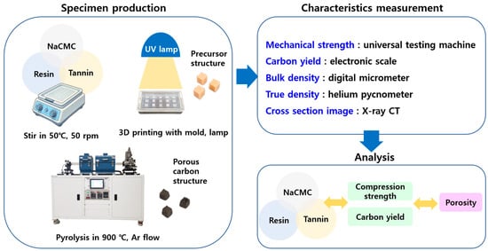 The resin, tannin, and NaCMC were mixed according to the ratios determined by the DOE methodology. The resin was blended with tannin and NaCMC using a stirring hot plate (Jeio Tech, Daejeon, Korea) at 50 °C and a stirring speed of 50 rpm for 1 h. The resulting mixture was then poured into molds fabricated from polydimethylsiloxane (PDMS) for specimen preparation. Photopolymerization was performed by exposing the filled molds to a UV lamp (405 nm, 15 W) for 6 h. Subsequently, a post-curing step was carried out using a Form Cure device (Formlabs, Somerville, MA, USA) at room temperature for 1 h. The final specimens prepared for carbonization were cubic in shape, with each side measuring 6 mm in length. To minimize experimental variability, 35 specimens were fabricated for each experimental condition.