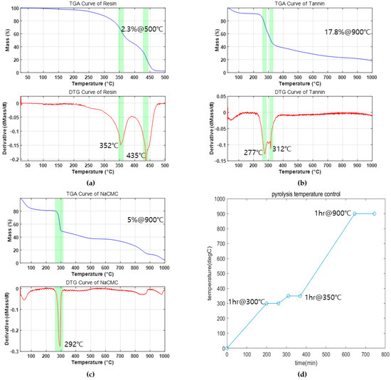 Thermogravimetric analysis of materials: (a) resin, (b) tannin, (c) and NaCMC, and (d) heating profile for pyrolysis.