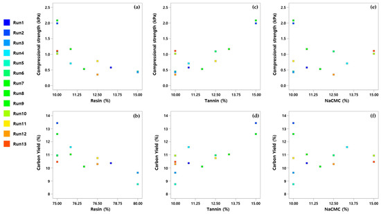 Correlation of material and carbon characteristics: (a) resin vs. compressional strength; (b) resin vs. carbon yield; (c) tannin vs. compressional strength; (d) tannin vs. carbon yield; (e) NaCMC vs. compressional strength; (f) NaCMC vs. carbon yield.