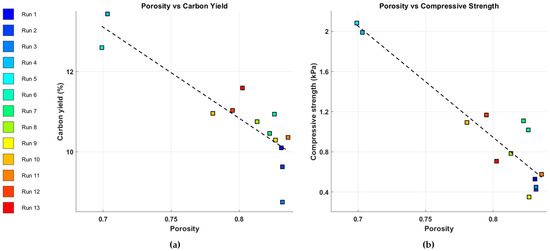 Correlation of porosity and (a) carbon yield or (b) compressional strength.