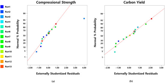 The normal probability plots of the residuals for the compressive strength and carbon yield responses are shown in Figure 6. Although the first experimental data point for compressive strength appears to be an outlier, the majority of the experimental points for both carbon yield and compressive strength are closely aligned along the reference line. This indicates a reliable agreement between the experimental results and the predicted values from the regression models.