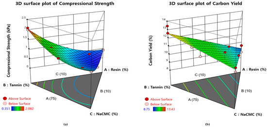 Using the DOE approach, regression models were developed to describe the relationships between the mixing ratios of resin, tannin, NaCMC, and the resulting carbon yield and compressive strength of the three-dimensional porous carbon structures. Two separate regression equations were generated, with the resin content, tannin content, and NaCMC content serving as independent variables. A Scheffé model, which is appropriate for mixture regression analysis, was employed to construct the equations. The resulting regression functions are presented in Equations (4) and (5).