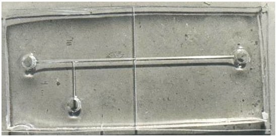The MoF devices were fabricated using PDMS through a primary–secondary approach based on inkjet 3D printing, described in detail elsewhere [14,40]. Briefly, the fabrication process followed a multi-step workflow: (i.) mold design in Autodesk®Fusion 360 (v.2.0.17721) software; (ii.) slicing and G-code generation with Objet software (v.9.2.11.6825); (iii.) mold fabrication using a PolyJet 3D printer. The 3D printer was a Stratasys Objet260 Connex1 (Stratasys, Los Angeles, CA, USA). PDMS was prepared by mixing the silicone elastomer base and curing agent in a 10:1 ratio for the device layer and a 5:1 ratio for the cover layer, which was then degassed, poured into the mold, and cured at room temperature for 48 h. The cured parts were demolded and bonded using a reversible process, with both surfaces plasma-treated for 3 min using a Plasma Bonding Pen (Elveflow, Paris, France) to enhance adhesion. The final bonded device is shown in Figure 2.