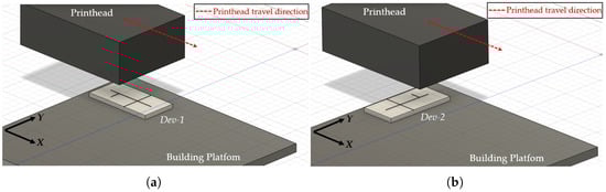 Figure 3. Schematic of the microchannel (mold) orientation with respect to the printhead travel direction: (a) parallel and (b) orthogonal to the direction of printhead travel. - Step 2. Observation collection. For each 3D-printed mol, the primary profile was acquired by using a KLA Tencor®P-7 Stylus Profiler (Gambetti, Milan, Italy) at a scan speed of 200 µm/s, an X resolution of 4 µm, and a Y resolution of 50.5 µm. For each mold a surface of 2000 × 4000 µ, oriented as represented in Figure 4a,b for Dev-1 and Dev-2, respectively, was mapped.