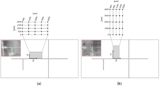 Figure 4. and Coordinates selected for the observations collection in Step 3 for (a) Dev-1 and (b) Dev-2. In the red inset, a picture of the final PDMS device highlights the effect of the printhead’s travel direction. - Step 3. ANOVA study. For each 3D-printed mold, the surface consistency was examined as follows: a replicated general factorial design was studied by means of a third-order model (p-value < 0.0001), which was the most significant from the sequential model’s sum of squares (Type I) test, with the aim of finding a suitable approximation for the true functional relationship between the primary profile and the set of independent variables. In detail, the investigated factors (independent variables) for the experimental design are reported below: