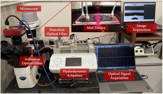 To generate the slug flow within the MoF device, deionized water and air were simultaneously injected through the two inlets of its T-junction geometry. This was achieved using two Fusion 4000 Independent Channels Syringe Pumps (Chemyx, Stafford, TX, USA), one loaded with deionized water and the other with air. These pumps enabled the precise control of the flow rate values and were connected directly to the device inlets. For the optical actuation, a NovaPro 660-125 laser system (RGB Lasersystems, Kelheim, Germany) was used, operating at a wavelength of 660 nm and a power of 1 mW. The laser light was delivered to the device via an actuation optical fiber with a 365 µm core diameter, inserted into the device’s actuation slot. Optical detection was performed using a 365 µm diameter output optical fiber connected to a PDA100A photodiode (Thorlabs, Newton, NJ, USA) with a gain setting of 40 dB, enabling the detection of light intensity variations. The photodiode output was recorded using a PicoScope 2204A USB oscilloscope (Pico Technology, Cambridgeshire, UK), operated at a sampling rate of 1.5 kHz for high-resolution signal acquisition.
