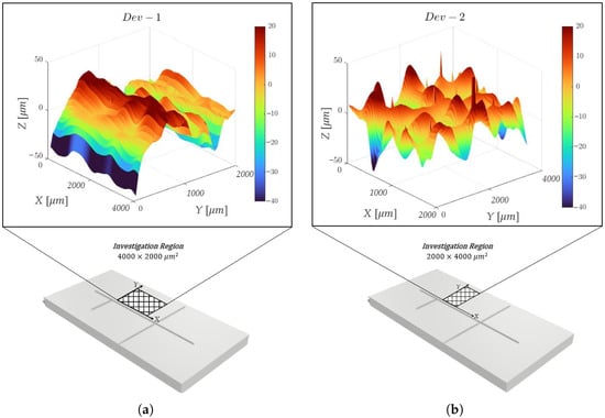 Surface profile acquired with a profilometer in the investigated region: (a) Dev-1 and (b) Dev-2.