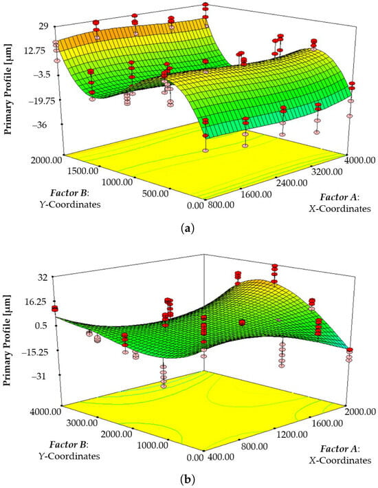 A three-dimensional response surface showing the expected primary profile [µm] as a function of the and Coordinates for the surfaces of (a) Dev-1 and (b) Dev-2.